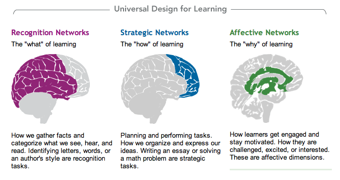 The Universal Design for Learning (UDL) is a new concept to me. I don’t believe you can prioritize the “most” important aspect. The what, why and how of learning are interconnected and all important. That being said, I believe that the why of learning is the most neglected in classrooms. Teachers tend to focus on what the student is learning and we spend lots of time having students demonstrate the how of learning, but we rarely spend time on the why. This is disappointing and confusing because the why is when students come alive and really connect to the learning.