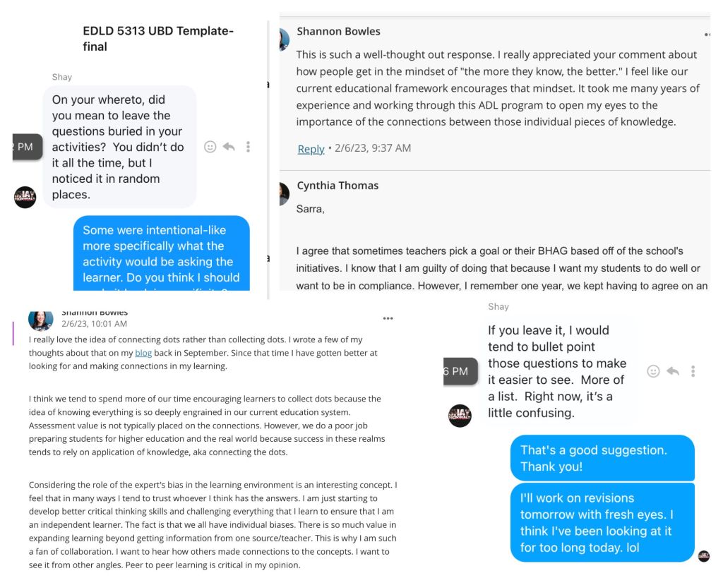 I was able to contribute to my learning community by continuing to work with my “collaboration crew” which includes Shay McDonald, Rebecca Rodgers, and Chantilly Sweet. This may be our last term to fully collaborate as we will be in different classes next term. They have been such a great support for me! We communicate primarily via Facebook messenger. We share our assignments and give each other feedforward. We also use our group as a sounding board for ideas, venting, questions, and general life cheerleading. I was able to expand my collaboration this term by connecting one-on-one with Catherine Duplisea and Angela King. I specifically connected with these additional peers because our innovation plans are similar and we are working with adult learners. It was great to talk with them about how the concepts we are learning apply to our audience.