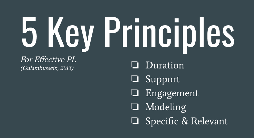 Gulamhussein, A. (2013, Sept). Teaching the teachers. Effective professional development in an era of high stakes accountability. Retrieved from Center: http://www.centerforpubliceducation.org/system/files/2013-176_ProfessionalDevelopment.pdf