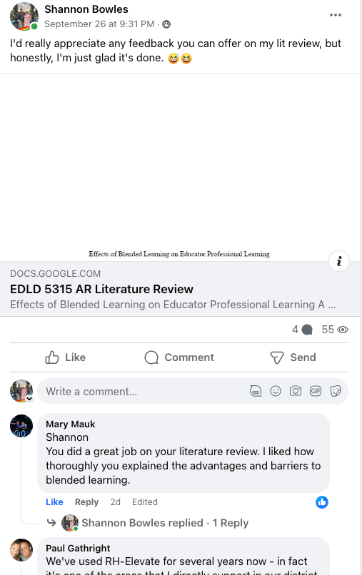 As I developed my action research question, measurement strategy, literature review, and action research plan I was able to participate in a peer review process. The peer review feedback that my collaboration group provided proved invaluable. Dawn, Kelly, and I took time to read each others’ outlines and literature reviews and leave comments to help improve our work. The process of revising assignments has been instrumental in honing my critical thinking and analytical skills. It has taught me the importance of iteration and refinement. I am grateful for the work I have done throughout the ADL program to align my thinking with a growth mindset because this helped me approach feedback from others as an opportunity for improvement rather than as criticism. Each revision cycle encouraged me to delve deeper into the subject and elevate the quality of my work. I believe that this commitment to continuous improvement will serve me well in my future endeavors as well.