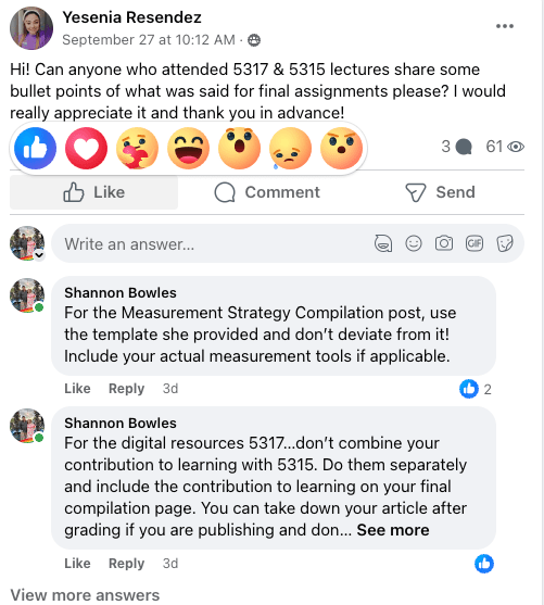 Another essential aspect of my journey has been self-reflection. I have made it a habit to regularly pause and contemplate my progress, strengths, and areas for improvement. Self-reflection allows me to identify patterns in my learning style, adapt my study techniques, and set meaningful goals. It also highlights how collaboration with my peers has amplified my learning experience. As I near the end of my ADL journey, I am cognizant of the progress I have made. In my last courses, I set a goal to be more involved in the course discussions. In this course, the collaboration was set up a little bit differently and I really appreciated the requirement for discussion responses to be meaningful. I tried to focus in on a few of my peers’ discussion posts. I was able to understand their research projects and passions better to then provide more purposeful feedforward.